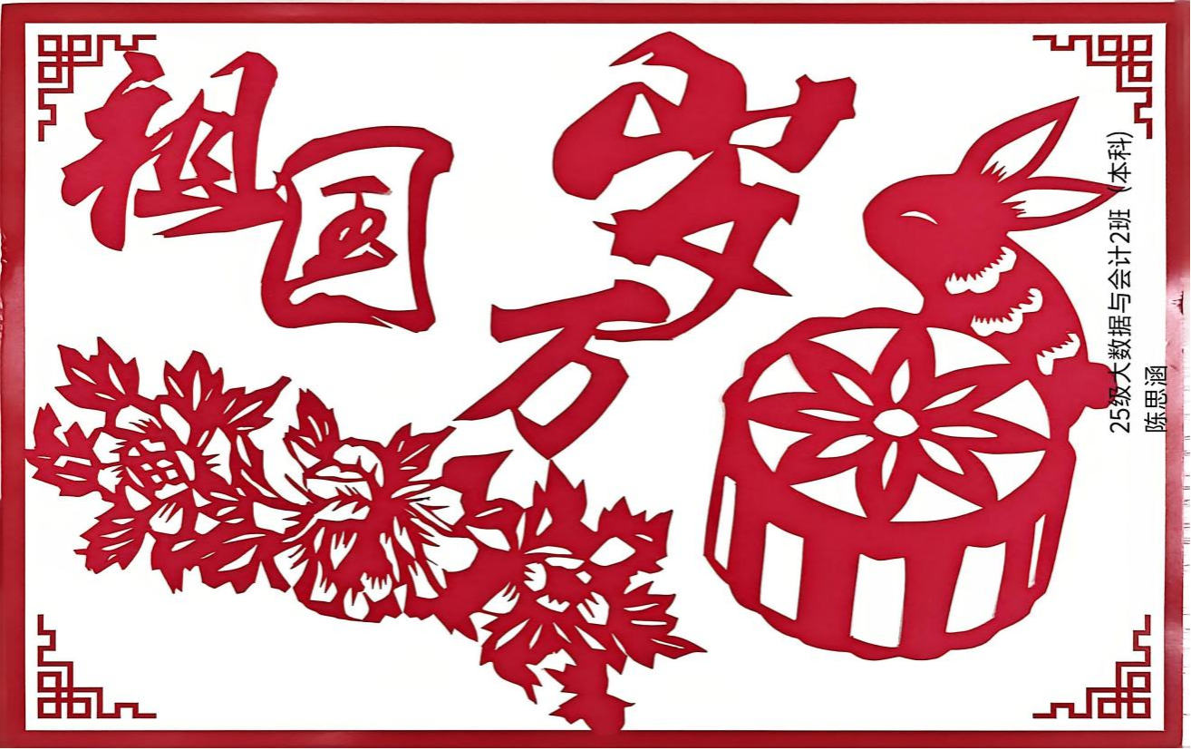 为传承非遗文化、弘扬传统美德,在双节期间营造浓厚校园文化氛围,商学院于2025年9月30日至10月17日开展“指尖凝双庆,艺心寄山河”铸牢中华民族共同体意识志愿服务系列活动。本次活动面向全体在校生征集手工剪纸作品,围绕“非遗传承”和“传统文化”两大主题展开,引导学生用指尖技艺传递文化情怀,用艺术表达礼赞祖国华诞。