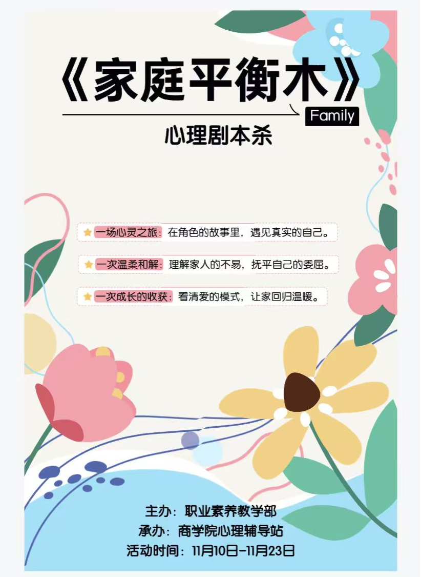 为深化“树心树人,关心关爱”心理健康教育成效,创新心理育人实践形式,商学院于近日成功开展《家庭平衡木》心理剧本杀活动。本次活动以家庭叙事为载体,引导学生在沉浸式角色体验中,实现心理共鸣与自我觉察的同步成长。